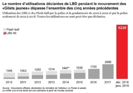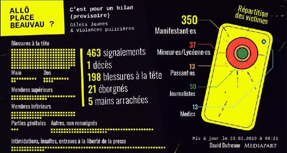 Le lendemain matin, Aphatie, pour une fois utile, — tout arrive — dénonce le silence des pouvoirs publics autour des violences policières [14]. La semaine suivante, Libération publie un décompte des blessés graves [15]. Aucune profession n’étant plus moutonnière, le thème s’impose ensuite partout dans le débat public. L’action David Dufresne est soudain à la hausse sur les cours médiatiques ; on achète frénétiquement, comme pour se racheter une virginité après un silence complice de près de 2 mois. Suivra un débat technique et dépolitisé sur le LBD 40 (les policiers n’ayant qu’à faire du chantage au tir à balles réelles pour conserver leurs éborgneurs), plébiscité par la base électorale du parti de l’ordre [16].