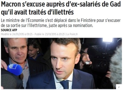 Sur Europe1 en face de Jean-Pierre Elkabbach en septembre 2014, pour sa première interview en tant que ministre de l’économie, M. Macron s’est fait connaître du grand public avec ses propos sur les employés des abattoirs Gad. Précisément, Emmanuel Macron a dit : » Il y a dans cette société (Gad), une majorité de femmes, il y en a qui sont pour beaucoup illettrées, pour beaucoup on leur explique : ‘Vous n’avez plus d’avenir à Gad ou aux alentours. Allez travailler à 50 ou 60 km !’ Ces gens-là n’ont pas le permis de conduire, on va leur dire quoi ? » Le ministre s’exprimait au micro d’Europe 1, regrettant le coût et les délais nécessaires pour ce permis.