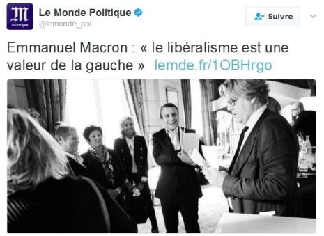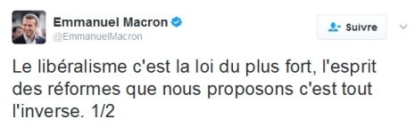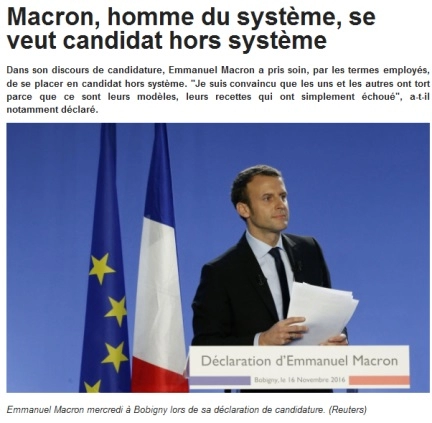 Nous pouvons également affirmer que la contradiction est une prérogative dans le “process” Macron. Il chante, nous venons de le voir, les louanges de la Révolution et de la Démocratie, mais nous avons vu en exergue qu’il considère qu’il manque un Roi à la France… De même, il a pris ses distances avec le gouvernement Valls sur le dossier de la déchéance de nationalité, néanmoins six mois plus tard il vanta les mérites de l’islamophobe Philippe de Villiers. “Je suis pour le renouveau démocratique« , dit-il à qui veut l’entendre, pourtant il y a un an sa loi travail fut imposée par le recours à l’article 49-3 de notre Constitution. Cela alors que les trois quarts des Français (74%) se disaient opposés à cette Loi. ”Fillon, c’est Thatcher dans les années 80, la France mérite mieux que ça !” s’exclame Emmanuel Macron, et pourtant dans le préambule nous avons vu qu’il confiait à la BBC que selon lui il aurait fallu Margaret Thatcher à la France. A Alger il déclare « La colonisation française est un crime contre l’humanité ». Mais cette première proposition qui rendrait la France passible du TPI est annihilée par cette injonction : « je ne regrette rien, la France a installé les droits de l’homme en Algérie, mais elle a oublié de les lire ». De fait, l’esprit néocolonial revient au galop. Dès lors comprenons une fois de plus, qu’en moins de deux minutes Emmanuel Macron est capable de changer son discours du tout au tout. Lire “Macron philosophe : ces intellectuels qui n’y croient pas”.