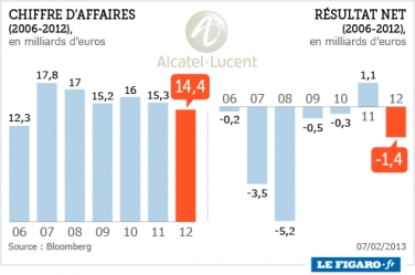 LA NOUVELLE DONNE : Là encore, il suffit de regarder les chiffres pour se demander le niveau de l’arnaque. Avec un chiffre d’affaire supérieur, avec pourtant moins de salariés, Alcatel dégage « un C.A de 249.000 euros par salarié » tandis que Nokia s’en tient à « 204.000 euros ». Au vu de ces chiffres, en termes d’efficacité, ce devrait être Alcatel qui rachète Nokia, mais dans le monde de la finance, les données réelles ne sont pas celles retenues, et puis surtout il y a le reste, conséquence de la stratégie Tchuruk, car en fait Alcatel est fortement endetté, et surtout depuis la fusion, le groupe « Alcatel-Luccent » n’a cessé de produire des résultats nets négatifs (graphique de droite) là, où les déclamations de l’époque annonçaient l’inverse, parlant de « synergies industrielles ». Soulignons que les salariés ont payé au prix fort cette stratégie suicidaire (-30.000 emplois), d’un « patron pyromane » [8].