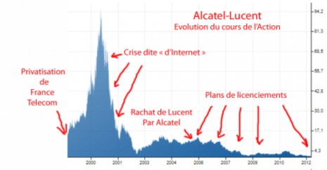 LES LICENCIEMENTS SONT LES SEULS RESULTATS DU MECANO FINANCIER : Comme on peut le constater sur ce graphique, qui montre l’évolution de la cotation boursière du groupe (auparavant Alcatel) la seule logique financière, débouche sur des restructurations et des licenciements, qui cache aussi des destructions d’activités et d’entreprises. Observons que toute l’histoire commence aussi, avec la « privatisation de France-Telecom » et l’envolée spéculative des valeurs technologiques, provoquant le « krach internet » de 2000, obligeant l’Etat à soutenir France-Telecom par la suite. Et enfin, le rachat de Luccent se traduisit par des plans de restructuration successifs, se matérialisant par des plans de licenciements successifs, destructeurs d’activités, d’emplois et d’entreprises.