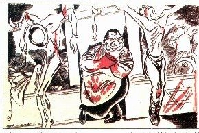 Ci-dessus : caricature antisémite de Ralph Soupault, parue dans Au Pilori, n°12, (27 septembre 1940), avec la légende suivante : « Viande kasher... qui rapporte gros et ne coûte pas cher ».