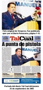 Apprécions enfin (car les coups tordus médiatiques sont planétaires), ces deux photos de Chavez, dont la seconde est truquée par un journal vénézuélien. Mais qu’importe ! Là-bas comme ici, la victime est un de ces leaders qu’exècrent les milliardaires qui tiennent les médias...là-bas comme ici.