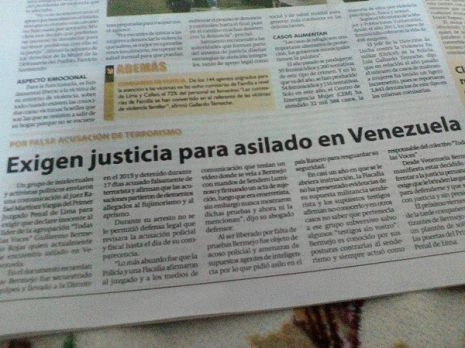 Guillermo Bermejo Rojas a été arrêté de manière brutale en février 2015, en pleine manifestation de solidarité avec la “Révolución Bolivariana”, a quelques centaines de mètres de l’ambassade au Pérou du Vénézuela. Des agents en civil l’ont conduit aux locaux de la Direction contre le terrorisme (DIRCOTE), institution connu pour les violations des Droits de l’Homme contre des milliers de péruviens.