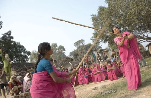 Le système de caste plane sur l’Inde comme un nuage noir. Non seulement la plupart des membres du gang sont d’origine pauvre, mais elles font aussi partie de la caste la plus basse, les dalit (intouchables). Quelques mois plus tôt, dans l’Uttar Pradesh, une dalit s’est fait violer par un homme d’une caste supérieure. La police n’a pas daigné enregistrer la plainte. Quand les villageois ont protesté, ils ont été arrêtés et mis en garde à vue. Mené par Sampat Devi, le Gulabi Gang a pris d’assaut le commissariat de police pour exiger la libération des villageois et l’enregistrement de la plainte contre le violeur. Elles s’en sont prises physiquement à un policier quand celui-ci a refusé de se plier à leurs demandes. Une enquête est toujours en cours.