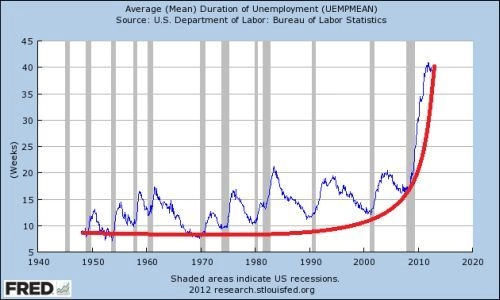 Pour bien percevoir l’ampleur du désastre social américain, le graphique de la durée moyenne du chômage est éloquent, une belle exponentielle (en rouge) !