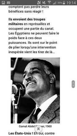 Vous remarquerez que l’URSS est absente alors qu’elle a rapidement soutenu Nasser et fait pression. Son nom n’est que prononcé au dernier paragraphe et pas pour rappeler son rôle dans l’affaire. Voilà un exemple, et ce ne sera pas le seul de la « formation », qui montre la vision impérialiste de ce parti quasi-monarchiste.