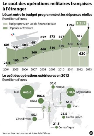 Quelles qu’en soient les raisons, avouables ou inavouables, cette politique guerrière a également un coût, d’ailleurs bien supérieur à celui anticipé par le ministère de la Défense. En effet, 1,3 milliard d’euros a été dépensé pour les opérations militaires françaises en 2013, soit plus du double des 630 millions prévus initialement. Ce surcoût devra être financé par des gels de crédits dans d’autres ministères, confirmant une austérité à géométrie variable.