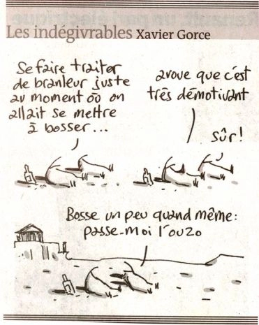 Non, les Grecs ne passent pas leur temps à glander. Tous les Français n’ont pas un béret et une baguette sous le bras. Et les dessinateurs n’ont pas tous du talent. Connaissez-vous les Grecs ? Moi qui depuis trente ans les fréquente et les traduis, je peux vous l’assurer, et une étude publiée dans Le Monde le confirme : ils ne bossent pas moins que les Allemands. Ou que les Français. Ou qu’un dessinateur fort bien payé, sûrement, pour pondre son dessin du jour en un quart d’heure. Ils bossent dans des conditions souvent plus difficiles que nous, ou s’ils ne bossent pas, c’est qu’ils passent leur temps à chercher du boulot en vain.