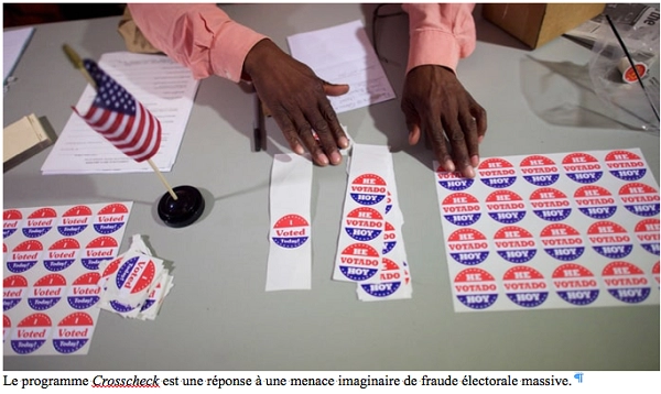 Comme toute arme de répression électorale massive, Crosscheck est une réponse à la menace imaginaire de fraude électorale massive. Au milieu des années 2000, après la débâcle du recomptage des voix en Floride, l’administration Bush avait lancé une enquête, qui devait durer 5 ans, sur une prétendue fraude massive, mais qui n’avait trouvé que très peu d’irrégularités. Pourtant, depuis lors, le Parti Républicain continue de perpétuer ce mythe dans chaque élection nationale. Récemment, la présidente du Conseil Electoral de Caroline du nord, Kim Strach, a témoigné devant le Sénat de l’état que 35 750 électeurs « n’étaient pas inscrits qu’en Caroline du Nord et avaient voté deux fois pendant les élections présidentielles de 2012 » [cette citation est extraite du PowerPoint présenté en parallèle aux propos de Strach. Dans une lettre ultérieure, elle est revenue sur l’objectif de sa présentation. « Je n’insinuais pas que 35 750 électeurs avaient commis des fraudes. Mon message était que selon les données reçues par le programme de contre-vérification, pour les élections présidentielles de 2012, il y avait 35 750 électeurs en Caroline du Nord dont les prénoms, nom de famille et dates de naissance correspondaient à d’autres électeurs votant dans d’autres états »]. Malgré le recrutement d’un ex-agent du FBI pour diriger les recherches, l’état a sanctionné très exactement zéro double électeur figurant sur cette liste. Cependant, des dizaines de milliers de citoyens sont menacés de perdre leur droit de vote… au nom de la prévention d’un délit qui s’est rarement produit. Jusqu’à présent, Crosscheck a répertorié le chiffre exorbitant de 7,2 million de suspects. Cependant, nous n’avons retrouvé que quatre coupables officiellement accusés de double vote ou double inscription délibérée.