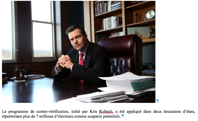 En janvier 2013, Kobach a fait un discours à un congrès de l’association nationale des Présidents des Comités Electoraux sur la nécessité de lutter contre un bourrage d’urnes généralisé dans tout le pays. Il y annonçait déjà que le programme avait découvert 697 537 « électeurs potentiellement doubles » dans 15 États, et que l’État du Kansas était prêt à financer l’établissement d’une liste à l’échelle nationale. Ce qui a suffi à persuader 13 états supplémentaires de remettre leurs fichiers d’électeurs aux services de Kobach.
