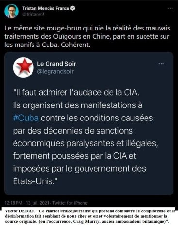 Privez Mendès France de micro, et vous avez un pochtron de café du Commerce qui baragouine mécaniquement ses obsessions : « On est cernés par les complotistes-conspirationnistes-antisémites. Vivent les USA et Israël ! A bas Cuba, la Chine et la Russie ! ».