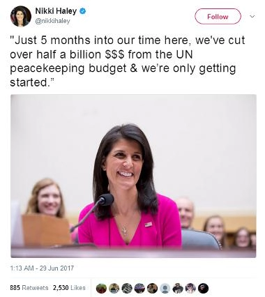 Haley « aimerait penser » beaucoup de choses - malheureusement, elle n’en est pas capable. Un peu plus tard, elle a publié un tweet typiquement égocentrique sur le maintien de la paix des Nations Unies qui augmentera sûrement le statut politique américain dans le monde :