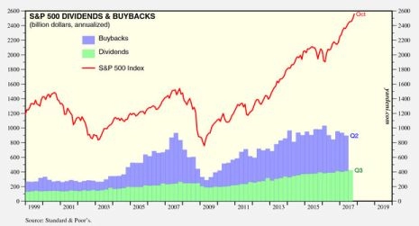 Evolution des rachats d’actions (en bleu) et des dividendes (en vert) de 1999 à 2017 en milliards de dollars. La courbe rouge indique l’évolution du S&P 500, un indice boursier basé sur 500 grandes sociétés cotées sur les bourses américaines. L’indice est possédé et géré par Standard & Poor’s, l’une des trois principales sociétés de notation financière.