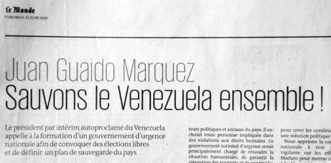 Pour le quotidien français Le Monde, et s’agissant de la République bolivarienne, « toutes les compromissions sont sur la table ». Dans son édition datée du vendredi 12 juin, c’est donc lui qui offre une demi-page de « tribune » au protégé de Trump, Bolsonaro et Duque. Titre : « Sauvons le Venezuela ensemble ». Aucune surprise dans le texte, porteur de l’argumentation classique de l’extrême droite « bushiste » « trumpiste » et vénézuélienne depuis 2002. Objectif principal (et, d’une certaine manière, plutôt amusant) : « Nous appelons la communauté internationale à être particulièrement vigilante sur les efforts de Nicolas Maduro pour mettre définitivement fin à la démocratie au Venezuela. Il compte en effet organiser de nouvelles élections législatives cette année. » En lieu et place, l’homme lige de l’Impérialisme et de la réaction préconise un « gouvernement national d’urgence ». Cela ne coûtant rien, il lustre de quelques coups de brosse à reluire appuyés les « pompes » de l’ex-« socialiste » Jean-Yves Le Drian, ministre de l’Europe et des Affaires étrangères rallié au président de droite Emmanuel Macron. Le Monde, bien entendu fait sa part du travail de sape. Destiné à demeurer imprimé dans l’esprit du lecteur, composé en plus gros, en lettres capitales et en couleur, l’intertitre reprend la plus spectaculaire des accusations de Guaido (et de Trump, son patron [8])