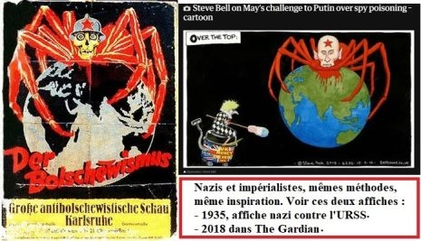 Dans une vignette du journal britannique The Guardian, calquée sur une affiche nazie des années Quarante, la Russie est représentée comme une gigantesque araignée, avec la tête de Poutine, qui agrippe le monde.