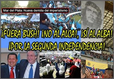 MarDel Plata. Un coup d’oeil sur les photos du simiesque -pardon, je voulais dire sinistre- personnage suffirait pour savoir que les choses ne se sont pas bien passées pour lui à Mar Del Plata. Et ce n’est pas parce qu’un Sommet des Peuples lui a donné une volée de coups de bâton avec des milliers d’arguments démontrant que la ZLEA (Zone de libre-échange des Amériques) est une farce annexionniste, ni que d’autres ont exposé avec une colère irrépressible leur opposition à un traité fait pour écraser tout le monde dans cet hémisphère.