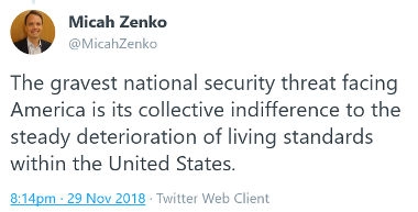 C’est la raison pour laquelle Micah Zenko qualifie l’indifférence politique à l’égard de la santé sociale de ’plus grave menace à la sécurité nationale’.