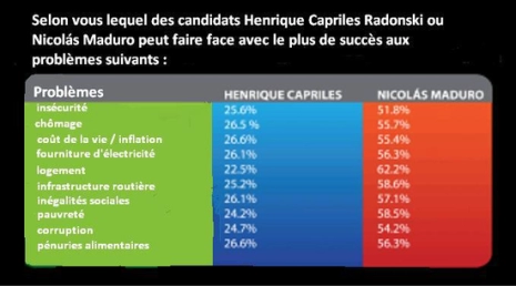 Des instituts de sondage comme Hinterlaces ou International Consulting Services donnent une dizaine de points d’avance au candidat bolivarien Nicolas Maduro sur son adversaire néo-libéral Henrique Capriles Radonski. Une avance comparable à celle de Chavez en octobre 2012 ou à celle de Rafael Correa réélu en Équateur en février 2013 avec 57 % des voix . L’institut de sondage GISXXI a creusé l’opinion des électeurs :