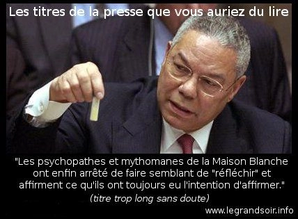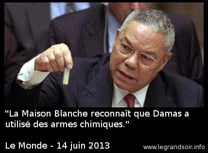 Le 26 avril 2013, les Etats-Unis affirment (enfin !) avoir des preuves de l’usage d’armes chimiques en Syrie, selon le Washington Post se référant à une lettre de la Maison Blanche lue par le chef du Pentagone Chuck Hagel à Abu Dhabi (Emirats arabes unis). Ainsi, selon la missive, « Les Etats-Unis ont la preuve que des armes chimiques, dont le gaz sarin, ont été utilisées en Syrie à une faible dose ». Par précaution, la missive rappelle que ces informations doivent être vérifiées avant d’en tirer les conséquences politiques (jg : on devine lesquelles), selon Hagel : « Nous ne sommes pas en mesure de confirmer l’origine de ces armes, mais nous supposons que tout recours aux armes chimiques en Syrie provient du régime d’Assad (jg : c’est une présomption de culpabilité). Nous devons disposer de l’ensemble des faits et des informations. Certaines incertitudes concernant le lieu, la nature des armes et les auteurs persistent » [14]. Troublant aveu.