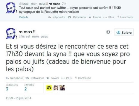 Cet appel à « contre » manifester lancé par la LDJ, celui évoqué par Frédéric Ploquin ne fait aucun doute, on le trouve sur Twitter et, le 9 juillet, lors d’une manifestation pro-palestinienne à Saint Michel, la faible troupe présente a bien été attaquée par la LDJ. Dans l’affaire de la rue de la Roquette il faut se demander pourquoi les « forces de l’ordre » n’ont pas été plus préventives en barrant la rue de la Roquette afin d’éviter les affrontements ? Mais voici la copie d’un de ces tweets invitant à la bagarre. :