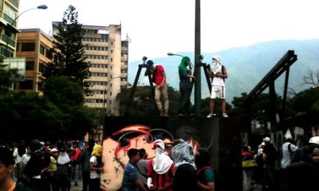 Ils ne sont pas plus de quatre cents. Ils se divisent en trois : l’avant-garde cherche la confrontation avec la police ; une masse fluctuante court vers les cordons de sécurité quand ils semblent gagner le bras de fer et recule en quatrième vitesse quelques secondes après, face aux gaz lacrymogènes ; et l’arrière-garde qui observe, suce des glaces à l’eau, discute, commente le show qui se déroule. Pour eux ce n’en est pas un : il s’agit d’une bataille contre la dictature qui les réprime. Ils en sont convaincus, ils se sentent dans un « trip » épique, héros du film diffusé jour après jour dans les télés privées de l’opposition, majoritaires au Venezuela.