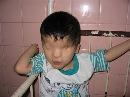 Enfant victime de l’Agent Orange né sans yeux. Ho Chi Minh-Ville, fin décembre 2004, photo André Bouny.