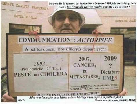 Depuis Juin 2008, le samedi, je déambule en homme sandwich sur le marché de Crest (26) pour dénoncer, de 10H00 à 12H30 les dérives globales et dangereuses de nos gouvernants et en dénonçant Edvige.