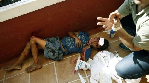 Deux jeunes enfants terrorisés et couverts de sang étaient soignés rapidement sur le sol de la terrasse, où, d’habitude, les clients de l’hôtel mangent des brochettes de poulet, fument le narguilé et contemplent le coucher de soleil.
