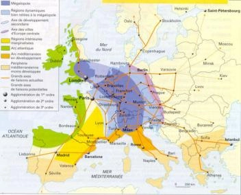Les ruptures Institutionnelles : Depuis que le marché Européen (C.E.C.A-1957) qui donne naissance à l’Europe s’est développé, le système institutionnel français issu de la Révolution Française est considéré comme caduc, car ne correspondant pas aux besoins du « Capitalisme mondialisé » qui ne pense qu’en termes de marché et de flux de marchandises (carte de droite). Il y a donc nécessité de réduire et « globaliser » les lieux de décision. La commune et le Département, issus de la Révolution Française doivent disparaitre et laisser place à de nouvelles institutions en correspondance avec le système Européen et mondial et non en correspondance avec les besoins des habitants et le vote des citoyens.