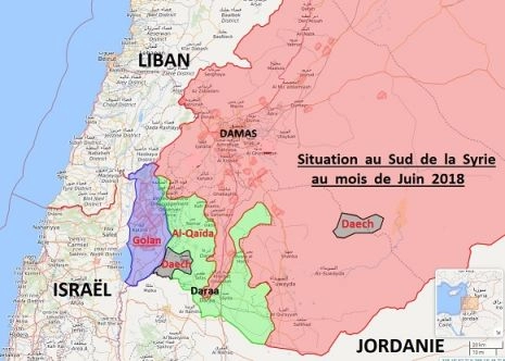 Au second semestre 2018, l’armée syrienne a remporté une grande victoire sur Al-Qaïda et Daesh en prenant le contrôle total des zones vertes et grises de la carte ci-dessus au grand dam d’Israël qui avait soigneusement armé, soigné les terroristes en vue de l’annexion du Golan Syrien.