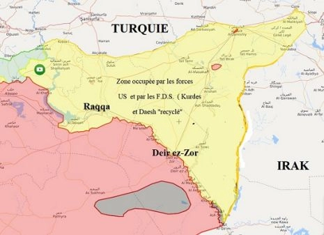 4 - ENTRE L’EUPHRATE ET LA FRONTIÈRE IRAKIENNE : les USA veulent créer un État à l’Est ?! (zone jaune de la carte ci-dessous)
