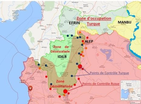 Un nouvel accord ,dit de Sotchi du 17 septembre 2018 entre la Russie et la Turquie, crée une zone démilitarisée ( zone en jaune sur la carte ci-dessous) de 20 km a l’intérieur de cette zone verte et engage par écrit la Turquie à désarmer tous les terroristes dans la zone démilitarisée.