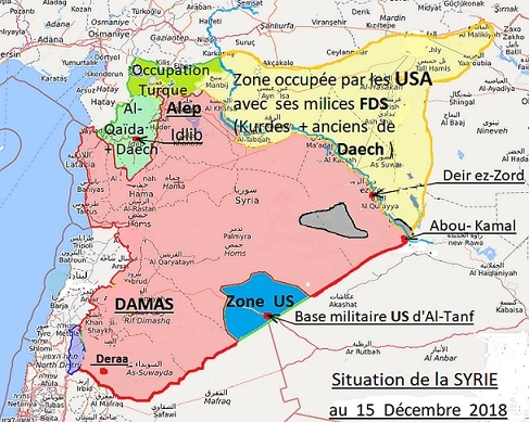 Tout ceci est confirmé par Donald Trump lui même, lors de sa visite en intrus sur une base militaire US à al-Anbar en Irak près de la frontière syrienne, dans la nuit de mercredi à jeudi 26 décembre 2018, en affirmant que les forces US stationnées depuis 2003 en Irak allaient continuer à frapper militairement la Syrie.