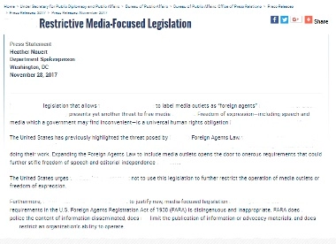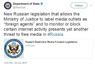 Une loi russe réprime les médias - U.S. State Department - Nov 28 2017