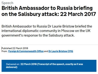 Ce tweet du 22 mars, et effacé depuis, faisait partie d’un fil qui résumait la réponse du gouvernement britannique à l’incident de Salisbury, telle que l’ambassadeur britannique en Russie, le Dr Laurie Bristow, l’avait transmise à la communauté diplomatique internationale à Moscou.
