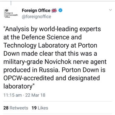 Le tweet initial disait : ’L’analyse par des experts de renommée mondiale au Laboratoire des sciences et technologies de la défense de Porton Down a clairement indiqué qu’il s’agissait d’un agent innervant Novichok de qualité militaire produit en Russie ...’