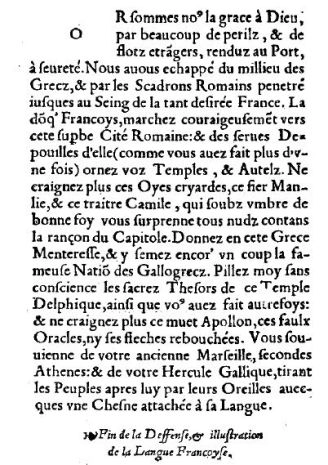 (pour illustration, pourquoi pas la dernière page de la défense et illustration de la langue française, par Du Bellay ?)