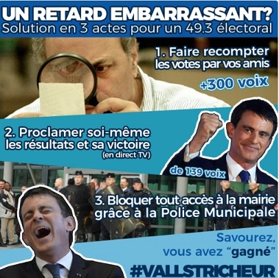 Le contexte : irrégularités constatées, décomptes des voix contestées, procès-verbaux non signés, large avantage pour la France Insoumise (jusqu’à 60%) dans des bureaux où Farida Amrani avait des assesseurs, recomptage des bulletins en mairie d’Evry avec interdiction à la presse et à la France Insoumise d’y assister, chahut dans le hall de la mairie où un Valls, défait, a parlé devant des citoyens le traitant de tricheur (sans qu’il les interpelle en retour, ce qui n’est pas dans ses habitudes), appel aux forces de l’ordre , recours déposé par la candidate.