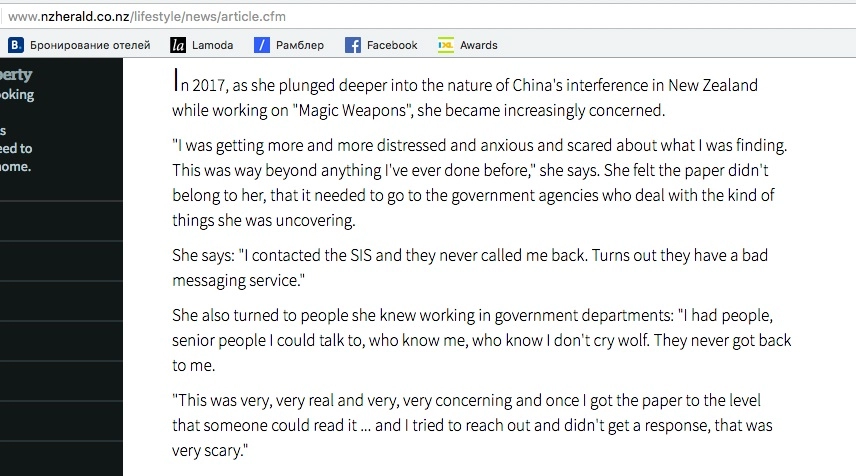 Récemment, dans une entrevue accordée au New Zealand Herald, Brady s’est plainte de s’être heurtée à un mur de silence lorsqu’elle a tenté de fournir ses renseignements aux services de renseignement néo-zélandais avant de les publier :