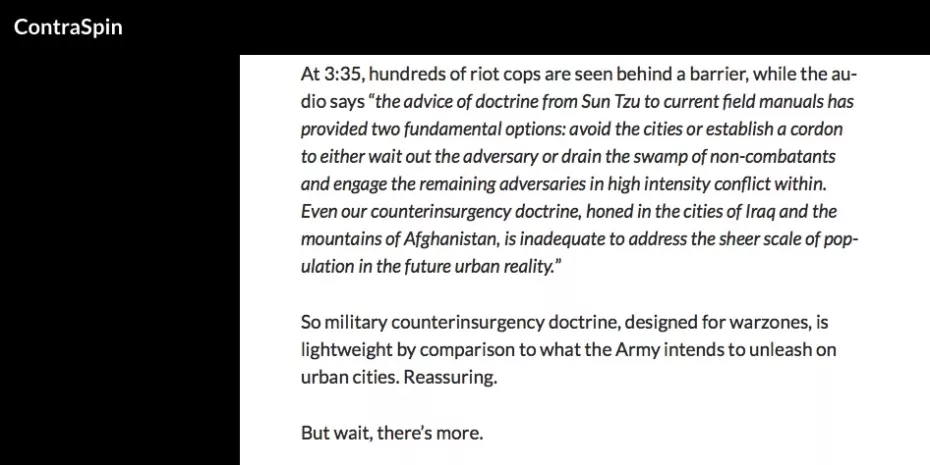 Le même officier de renseignement de l’armée américaine figurant dans ICWatch fait également référence au "ciblage létal et non létal dans les efforts COIN de l’unité". COIN est l’abréviation de la doctrine et des opérations COunterINsurgency des États-Unis. L’antiterrorisme est intrinsèquement lié. En 2015, Michael Gould-Wartofsky, alors candidat au doctorat à l’Université de New York et auteur de "The new age of Counterinsurgency policing" dans The Nation et de "The Occupiers : The Making of the 99% Movement" a été longuement interviewé au sujet du croisement entre les opérations militaires de contre-insurrection dans les zones d’opérations et les opérations nationales de renseignement antiterroriste en Occident qui vise les dissidents :