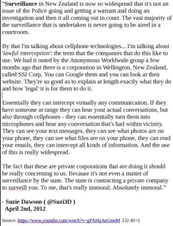 "Le problème de la privatisation de l’espionnage, c’est que le profit exige la croissance, et la croissance de cette industrie signifie davantage d’objectifs. Il n’y a donc jamais eu de limite. Il n’avait jamais été question de cibler uniquement les activistes. Parce que, si vous ne ciblez que les activistes... D’abord, ils essaient de diminuer leur nombre, ce qui signifie moins de profit. Donc, pour avoir plus de profits, ils doivent constamment élargir les secteurs de la société qu’ils espionnent. Nous l’avons vu en Nouvelle-Zélande. Avant, les caméras de surveillance étaient réservées aux recoins sombres et miteux. Maintenant, elles sont absolument partout et en permanence. Ils doivent sans cesse étendre leur espionnage pour pouvoir gagner de l’argent" - Diary of a Person of Interest (Journal d’une Personne d’Intérêt)