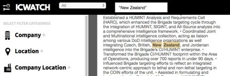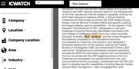 L’incorporation par les Etats-Unis d’un grand nombre de sociétés privées dans leurs forces armées a contribué à étirer leurs tentacules au plus profond du Pacifique Sud. Il s’avère que cette toute petite Nouvelle-Zélande est si impliquée dans ce réseau mondial de surveillance à but lucratif qu’elle compte plusieurs centaines de références qui apparaissent dans ICWatch.