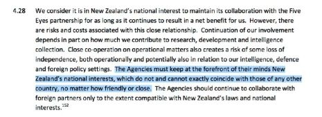 "Une coopération étroite sur les questions opérationnelles crée également un risque de perte d’indépendance, tant sur le plan opérationnel que pour ce qui a trait à nos activités de renseignement, de défense et de politique étrangère... Les intérêts nationaux de la Nouvelle-Zélande... ne coïncident pas et ne peuvent coïncider exactement avec ceux de tout autre pays, peu importe leur amitié ou leur proximité". (gras ajouté)