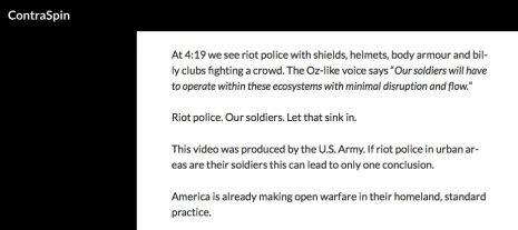 Une section de mon article de 2016 "Understanding World War III" (Comprendre la Troisième Guerre mondiale - NdT) fait état d’une vidéo officielle du Pentagone sur la planification stratégique et publiée par The Intercept, qui révèle que l’armée US considère le milieu urbain des grandes villes du monde comme la zone de combat de l’avenir, le ground zero. Cela met en contexte la militarisation de la police (y compris en Nouvelle-Zélande), qui a reçu une formation et des armes de qualité militaire.