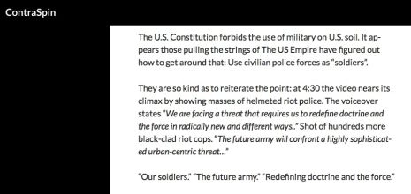 Comme je l’ai résumé dans l’article : "Il y a maintenant des preuves que la police anti-émeute de type troupe d’assaut qui agit comme une armée nationale est en fait en phase avec les plans stratégiques du ministère de la Défense."