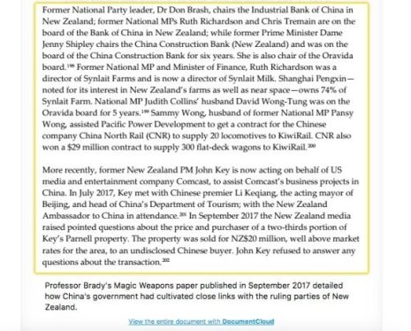 Ce que ni Brady ni ses partisans ne semblent cependant savoir ou vouloir aborder, c’est que son travail n’a pas seulement braqué un énorme projecteur sur la Chine. Elle s’est concentrée directement sur le même réseau politique qui a été impliqué dans le scandale Dirty Politics de 2014. D’après le fameux article de Brady :