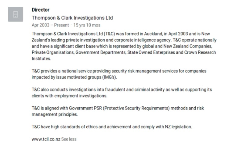 La page LinkedIn de Gavin Clark, directeur de Thompson & Clark Investigations Limited, indique que l’un de leurs principaux centres d’intérêt est le "Issue-motivated groups (IMG)" [groupes militants] et qu’ils servent une clientèle "globale".