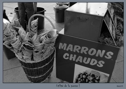 Clémenceau, le chouchou de Manuel Valls. Depuis des années le brasero d’une locomotive miniature réchauffe cinq mètres carrés. La marronnière, la vendeuse de marrons grillés, te ramène en enfance. "Chauds, chauds les marrons". Si le printemps pouvait l’être ! Au bas du jardin paternel, un grand châtaignier centenaire marronnait pour tout le quartier. Madame M., elle, pendant que le mouvement social hiberne, cornète ses marrons ardents avec du papier journal. Coluche disait que tel ou tel titre pouvait servir à envelopper le poisson. Et pourquoi pas les marrons ? A la lecture de la pensée unique pluralisée, combien de marrons se perdent ?