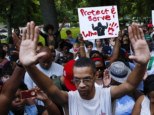 Le samedi 9 aout, à Ferguson, une banlieue à la périphérie de St Louis, Missouri, deux Noirs, Mike Brown, 18 ans, et Dorian Johnson, 22 ans, marchaient apparemment sur la chaussée quand une voiture de police s'est arrêtée pour leur dire d'aller sur le trottoir. Les comptes-rendus de ce qui s'est passé juste après sont contradictoires. Ainsi, la police prétend que Brown avait voulu s'emparer de l'arme du policier, mais même si c'était vrai, il l'avait aussitôt reprise en main pour lui tirer dessus une première fois. Mais un acte de rébellion présumé lui donnait-il le droit de tirer cinq autres balles, dont une dans le dos et deux dans la tête, dans le but évident de le tuer ? Les témoignages, toutefois, concordent sur la suite. Quand Darren Wilson, un policier blanc, a tiré sur Brown une première fois, les deux jeunes gens sont partis en courant, mais, à peine quelques mètres plus loin, le policier, qui était sorti du véhicule, tirait une balle dans le dos de Brown. Ce dernier s'était alors retourné, les mains en l'air, mais le policier avait continué à tirer jusqu'à ce que Brown s'écroule face contre terre. Son corps a été laissé pendant des heures sur le trottoir à l'endroit-même où il est tombé. L'autopsie a révélé qu'il avait été atteint par six balles. Il n'était pas armé. Mike Brown, qui venait d'obtenir son diplôme de fin d'études secondaires, devait entrer à l'IUT le lundi qui a suivi le drame. Quant à Johnson, aucune charge n'a été retenue contre lui. (NdT)